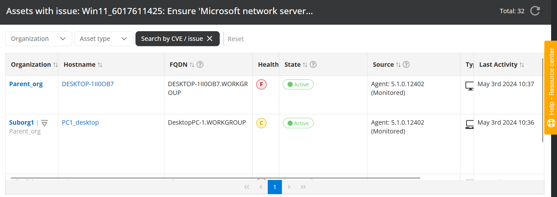 - Assets search: Allows entering an asset hostname or FQDN to locate the asset within any organization and get information about its health.