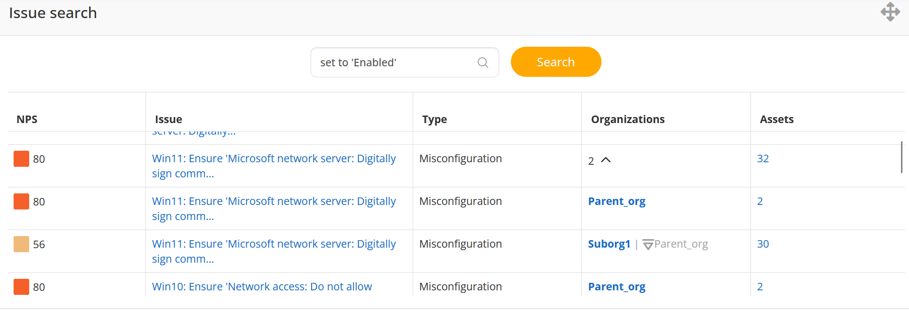 Issues are grouped by their title. Vulnerability, Misconfiguration, and Patch issues with the same name can appear in multiple organizations. Other issue types are more often unique per organization.